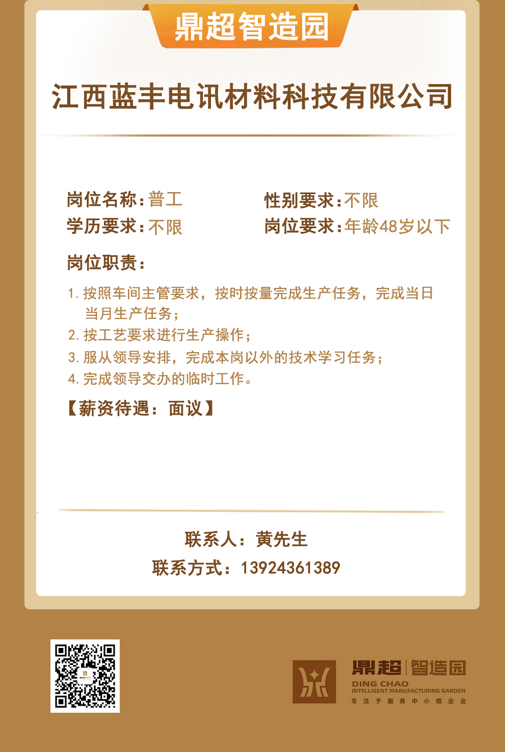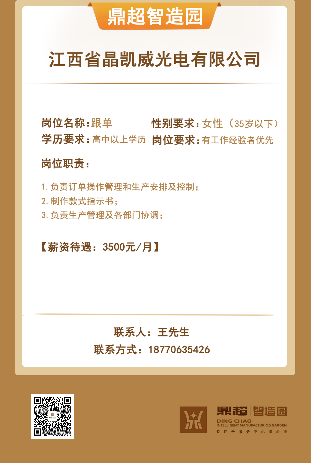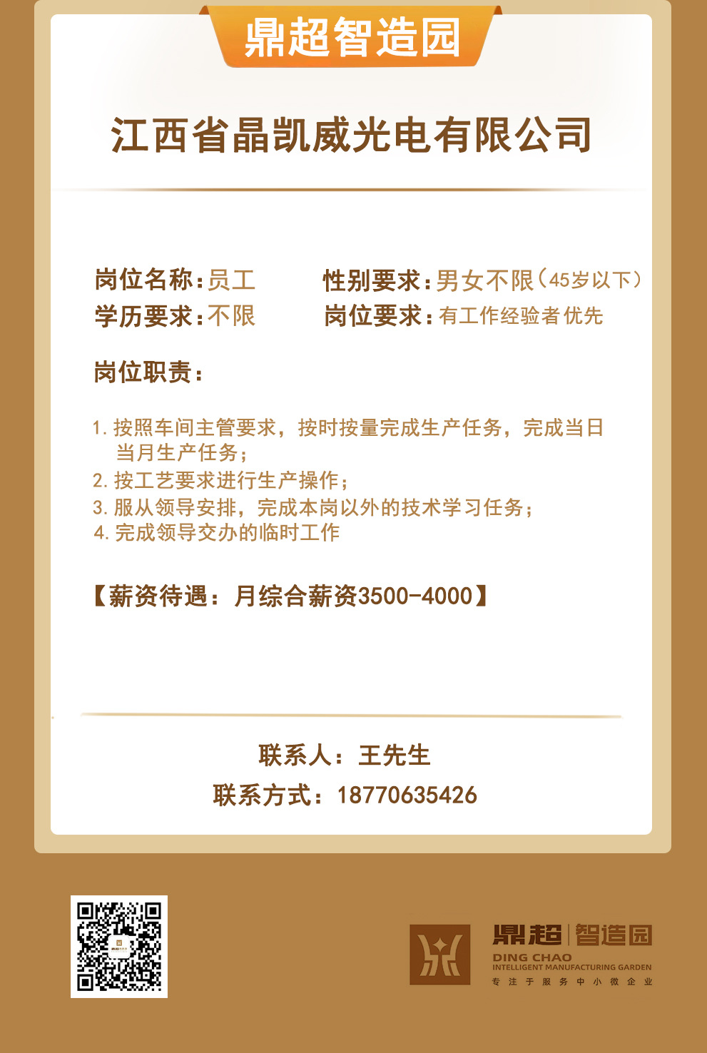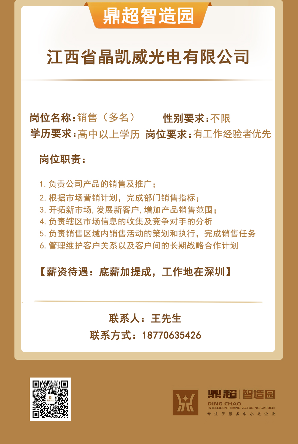 岗位要求:从事销售工作一年以上,沟通应变能力要强,要有一定的判断能力。没有销售工作经验的 ,沟通能力强也可以。(年龄要求:26-35岁以下)薪资:7K-12K